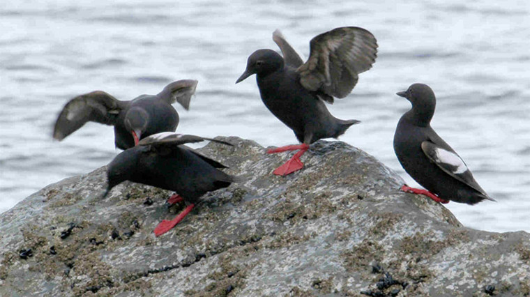 The Pigeon Guillemot is the only member of the alcid family to nest in Island County. It is considered an indicator species of nearshore health, since this bird feeds heavily on forage fish and other small marine creatures it catches by diving beneath the surface.