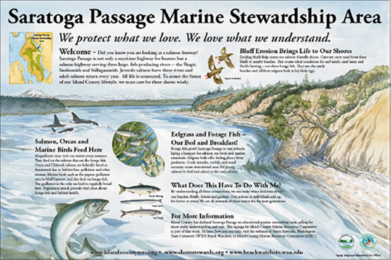 A generic Saratoga Passage or Admiralty Inlet Marine Stewardship Area panel is displayed at almost every location to explain marine stewardship and shoreline processes. At many sites, additional MRC signs are displayed alongside the generic sign to provide more detailed information about the history or attributes of the specific location.